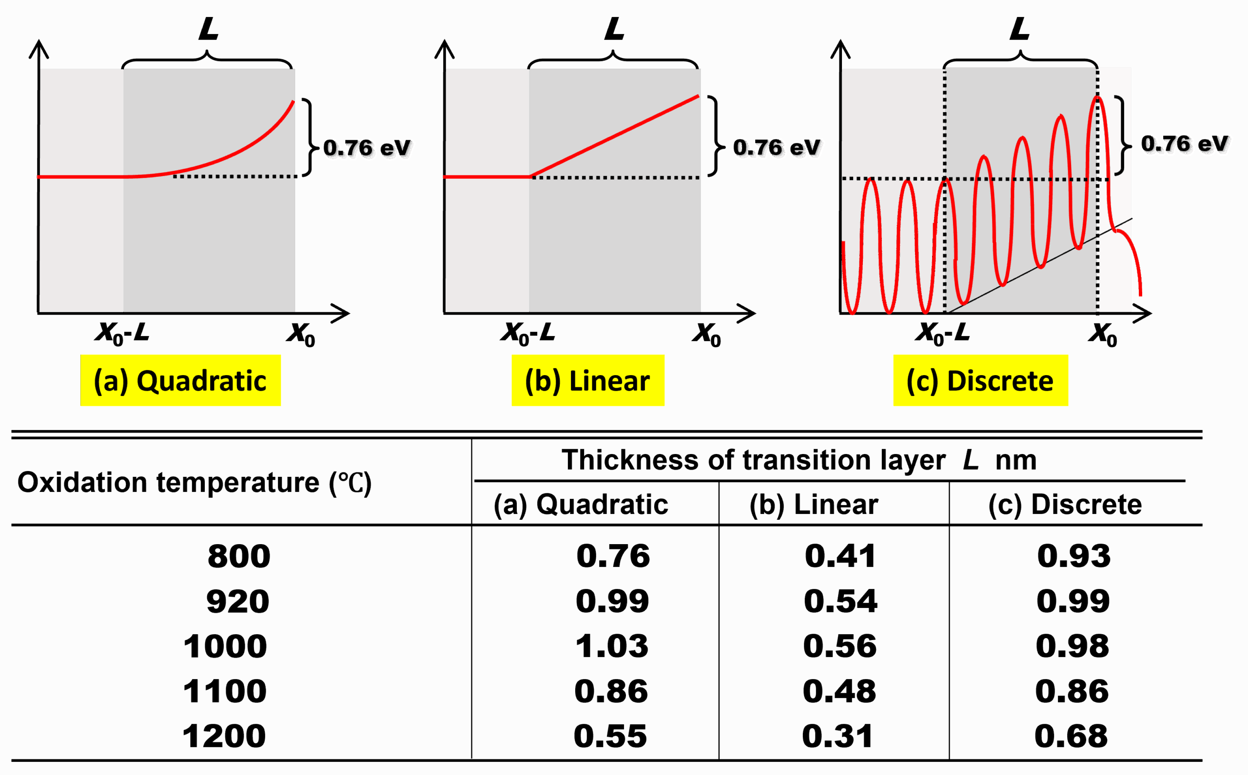 が初期異常による、線形-放物型曲線からのずれに相当します。Fargeixが示したように、酸化速度の逆数\(dt/dx_0\)の勾配は\(x_0\rightarrow 0\)で増大しますので、\(dD_0/dx_0 <0\)でないといけません。つまり、酸化膜厚が薄くなるほど\(D_0\)が増大しなければ初期異常を説明できなくなるのです。これはDeal-Grove方程式とは真逆の結論です。